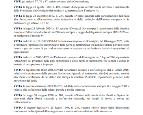 Schema di Decreto Legislativo attuativo della direttiva UE 2023/970 sulla trasparenza salariale.